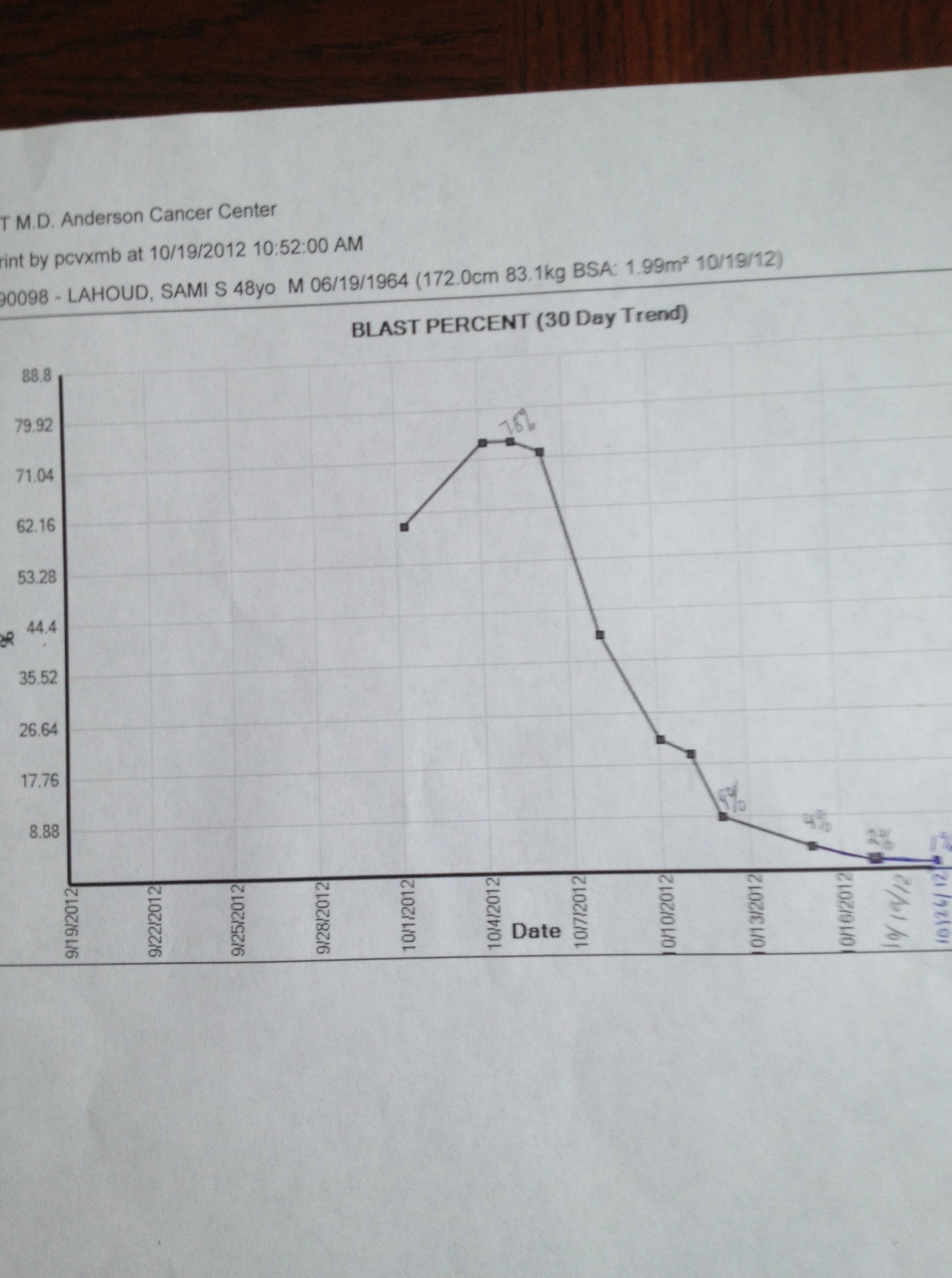 My blasts (Leukemia Cells) are still at 1% in my blood,which is a reflection that I still have some blast in my bone marrow. I had a bone marrow aspiration last week and it reflected an 8% blast, which is a blessing since it was at 85% in my bone marrow before starting the new medication. At this stage the physicians are really happy with the results and believe that the medication is working great. We are currently waiting on my blood counts to start ramping up to their normal levels. Once that happens and my blasts are “crushed”, then I will be considered in complete remission … hopefully soon.
